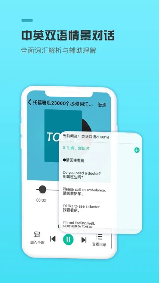 2.每日更新地道实用的英语对话,带动口语、单词、语法、听力、阅读等能力的全面提升。
