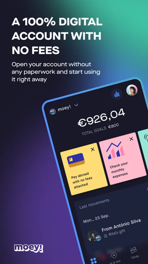 Your moey! bank account is 100% digital, has zero costs and works with MB WAY