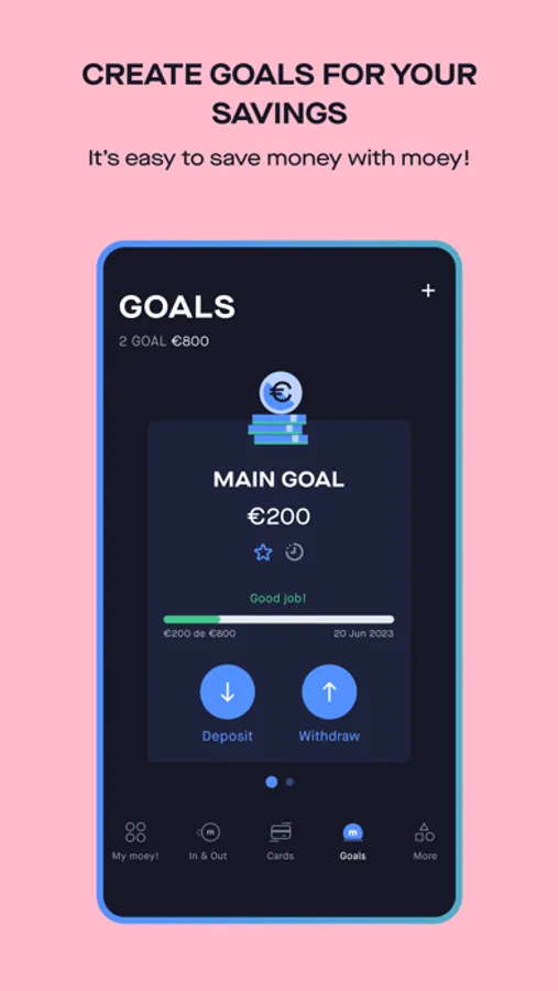 - Goals: save money easily. Set your saving goals, when you want to reach that goal and how often you want to save.