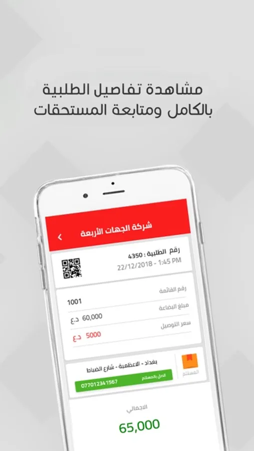 - واجهة تفاصيل دقيقة لكل طلب بمبلغ التوصيل ومبلغ البضاعة