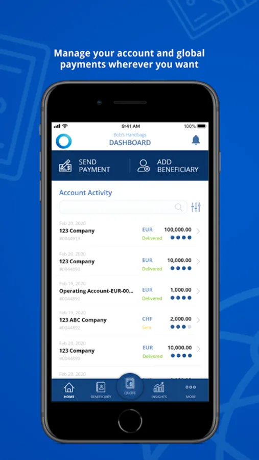 Flexible, end-to-end management of all your cross-border transactions for any-sized business. This powerful dashboard gives you a clean visual snapshot of your account with live rates of exchange and the ability to book a single transaction or set up multiple payments in a few clicks.