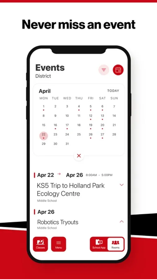 The event section shows a list of events throughout the district. Users can add an event to their calendar to share the event with friends and family with one tap.
