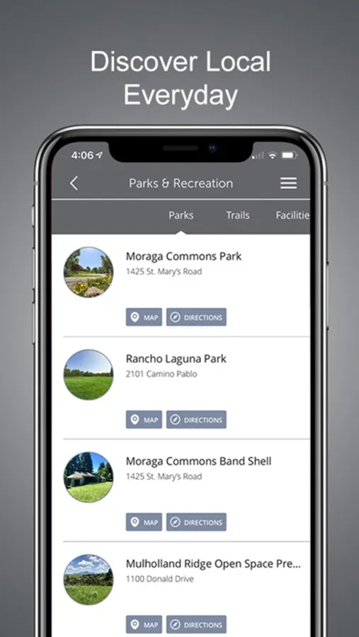 Town Hall, Community, and Parks & Recreation sections allow you to have all the important contact and destination information in your town with the tap of a button. Learn about your town's history, demographics and elected officials. Find parks, facilities and points-of-interest along with information, phone numbers, maps and directions.