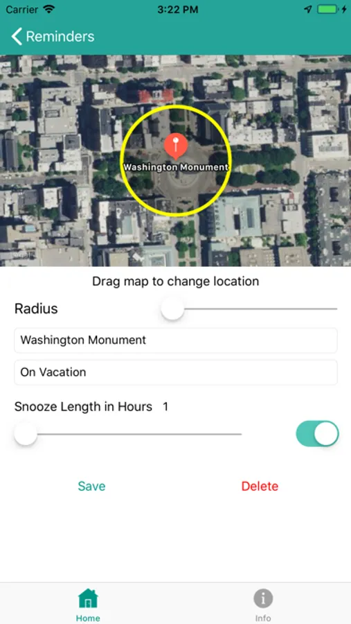 Set a location by searching for a place, long press and move the map marker to enable more precision. Set the notification radius to the size you want for accurate reminding.