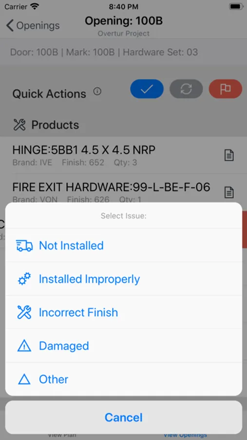 The Installation tool allows users to mark the hardware items that are installed for an opening, or the opening itself, as they proceed through a project installation. Users can add notes, take photos, attach pre-snapped photos, or add voice memos to document their work at the time of installation.