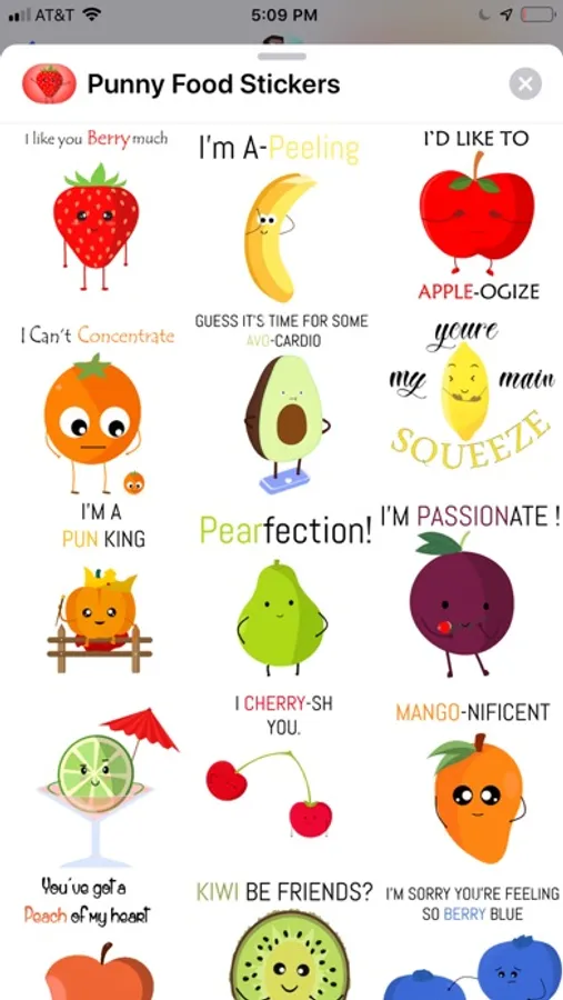 Very punny animated food puns stickers for iMessage texts. Currently, we have funny punny fruit pack. More variety of food coming soon like vegetable, plants, fast food, desserts, and more!