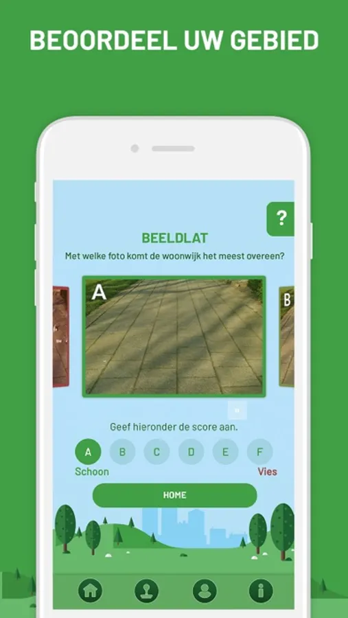 In de app kunt u maandelijks aan de hand van een aantal vragen uw mening geven over het schoonniveau van het gebied waar u zich momenteel bevindt en ter plekke een foto uploaden in de app.