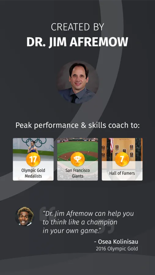 Created by Dr Jim Afremow (Arizona State, San Francisco Giants), Champion's Mind contains over 130 mental training sessions to help you master the mental component of your sport. Each session is built on the wisdom Jim has used as a mental skills coach and sports psychologist to 17 Olympic Gold Medalists, 7 Hall of Famers and the San Francisco Giants.