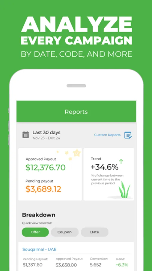 ArabClicks’ App makes it easy to keep track of your affiliate campaigns, using just your mobile. Easily monitor your running promotions, see money-making coupons & discounts and act immediately to earn from the trend - wherever you are!