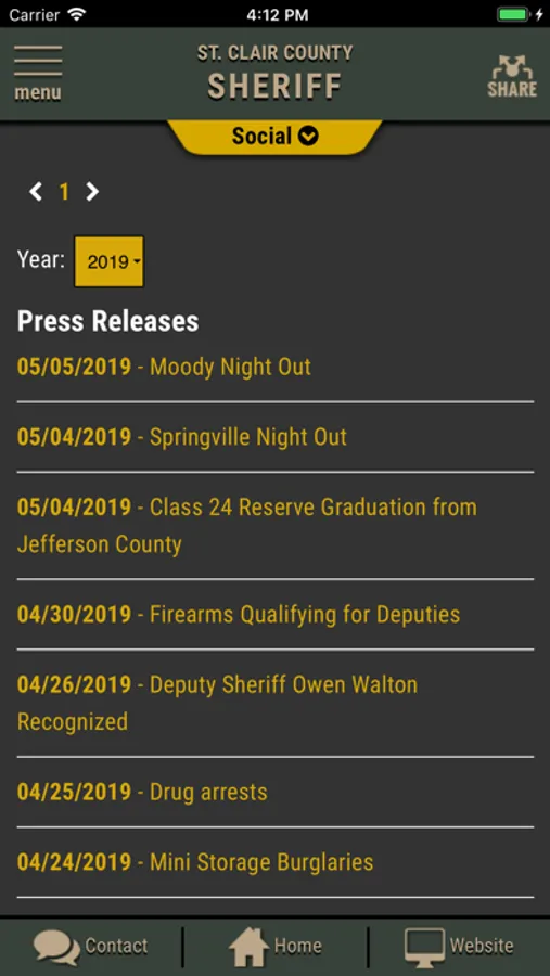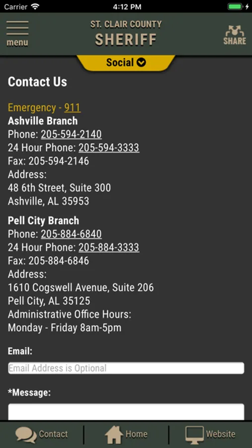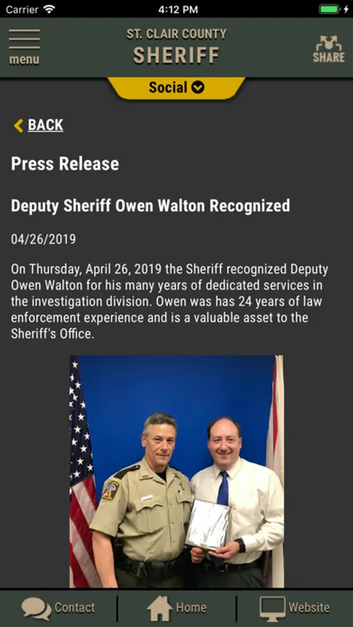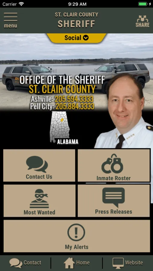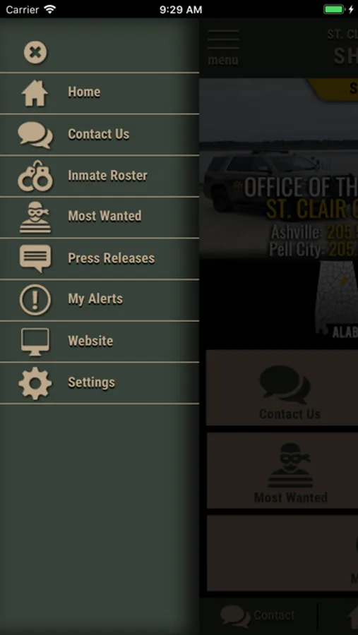 The app has public information for press releases, inmates, most wanted and special alerts. Contact us messages can be sent to the Sheriff's Office.