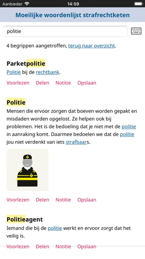 In de Moeilijke Woordenlijst Strafrechtketen worden veelgebruikte begrippen uit de strafrechtketen in begrijpelijke taal uitgelegd. Deze app is geschikt voor iedereen die moeite heeft met juridische begrippen en voor professionals uit de strafrechtketen die werken met mensen met een Licht Verstandelijke Beperking. De app maakt deel uit van de Basistool Strafrechtketen.