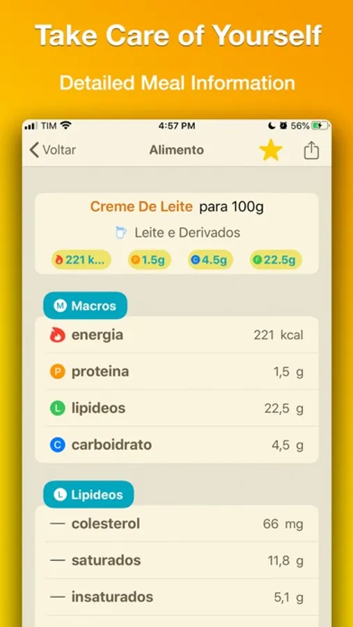 - Allows you to change the volume / quantity in grams of each food by automatically calculating the nutritional properties and compositions