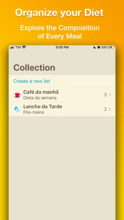- Create lists to organize your diets: for example, create lists of breakfast, post workout, afternoon snack, etc!