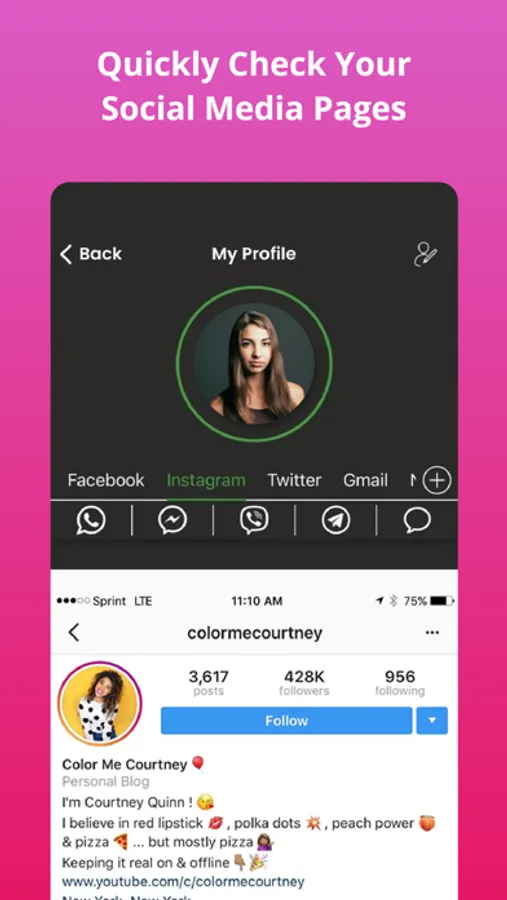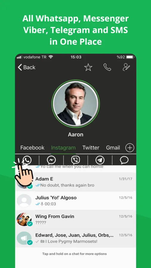 AnyMessage lets you quickly access your contacts’ messages in Instagram, Facebook, WhatsApp, Messenger, Twitter, Viber, Telegram, iMessage, and Gmail. Therefore, there is no need to waste time opening all apps and contacts' pages each time.