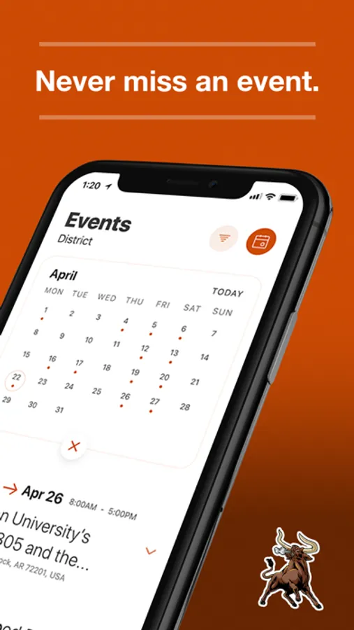 The event section shows a list of events throughout the district. Users can add an event to your calendar to share the event with friends and family with one tap.