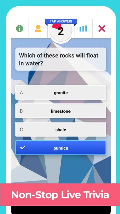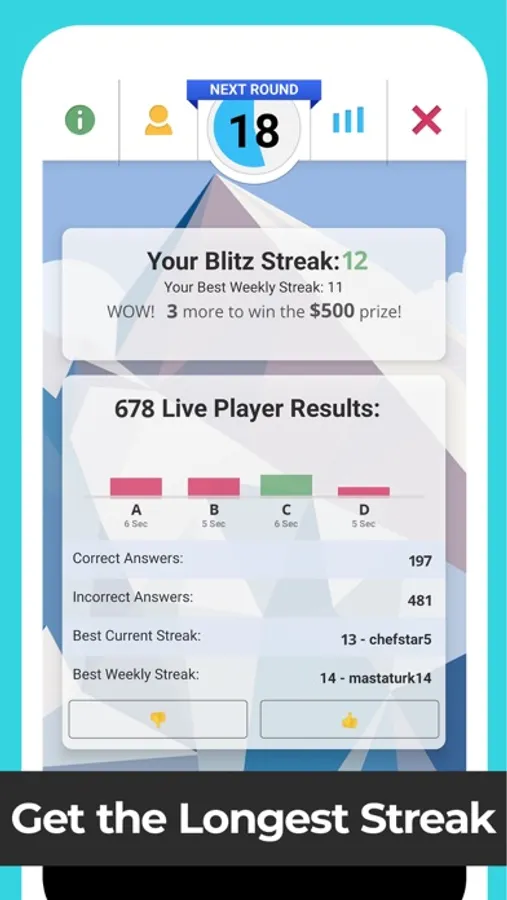 Non-stop trivia action, answer a question every 60 seconds! See how many you can general trivia questions you can get right in a row, if you make it to the top of the leaderboard, you have a chance at winning a weekly prize!