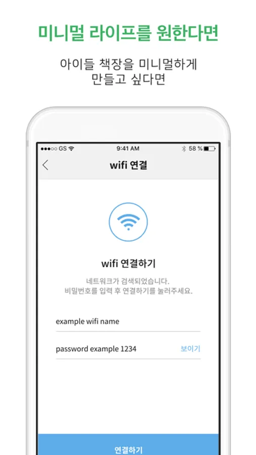 8. Wi-Fi에 비밀번호가 설정되어 있다면, 비밀번호를 입력 후 ‘연결하기’버튼을 터치합니다.