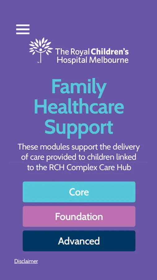 Family Healthcare support is community based care of children with complex needs. The app is designed to align with other RCH apps and is publicly accessible.