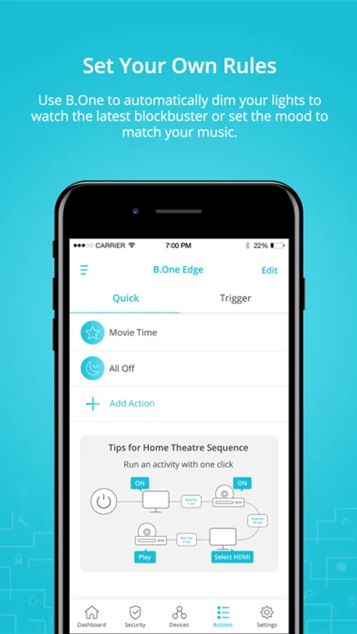 B.One Edge "Actions" enables you to control multiple devices with one single touch or voice command. With "Actions", you can customise and control multiple events at your Home.
