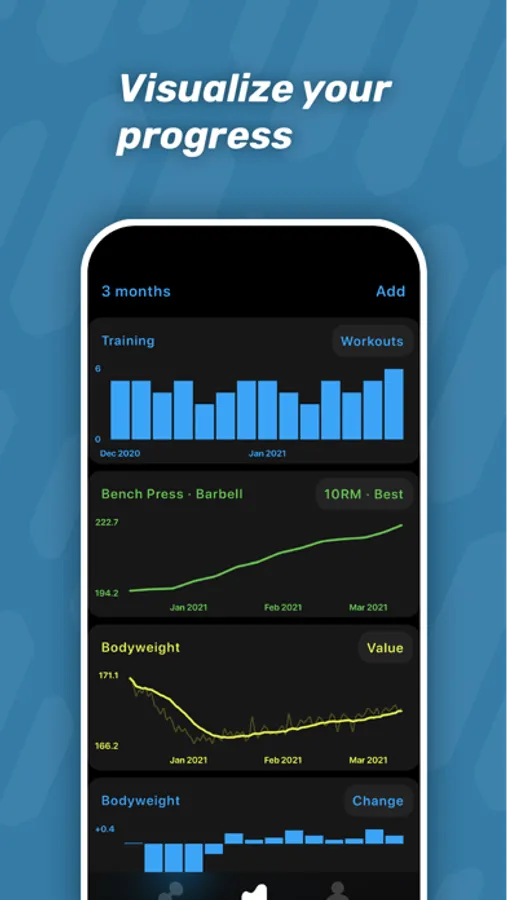Optimize your strength training with our graphs and insights. Visualize your workout history and analyze how your muscle-building and strength training have evolved over time.