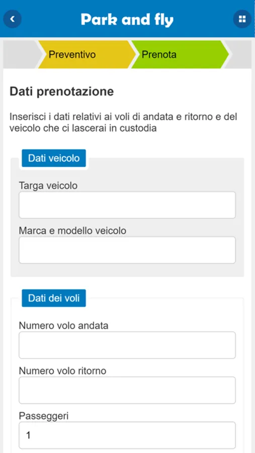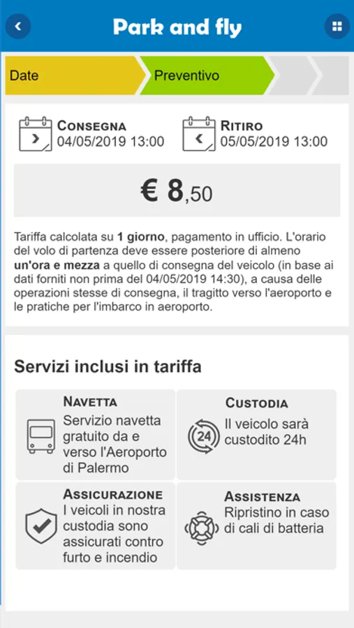 App per prenotare il servizio Park and fly. Il Park And Fly è un servizio di parcheggio per la propria autovettura all'interno di apposite aree sicure e videocontrollate nei pressi dell'aeroporto. Tramite un servizio navetta veloce e puntuale, verrete accompagnati alla vostra partenza all'aeroporto e di lì prelevati al vostro arrivo per ritirare la vostra vettura nelle nostre strutture. Il servizio è valido limitatamente per l'aeroporto Falcone e Borsellino a Palermo