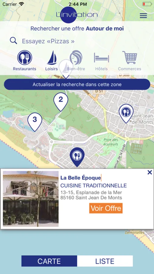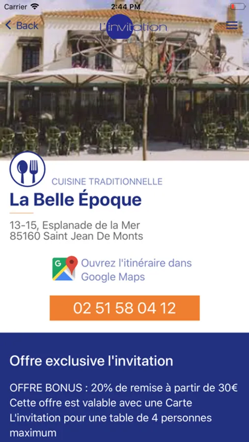 Découvrez la nouvelle application et entrez dans le club L’invitation ! Avec la carte « L’invitation » et son application mobile, vous accédez et bénéficiez pendant un an et de façon permanente à de nombreuses réductions (remises de 10%, 20%, 30%, offres en 1 acheté = 1 offert) au restaurant, à l’hôtel, pour vos loisirs, chez vos partenaires beauté & bien-être ainsi que dans de nombreux commerces.