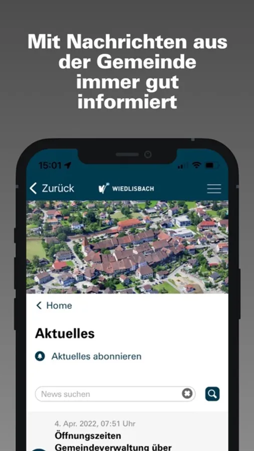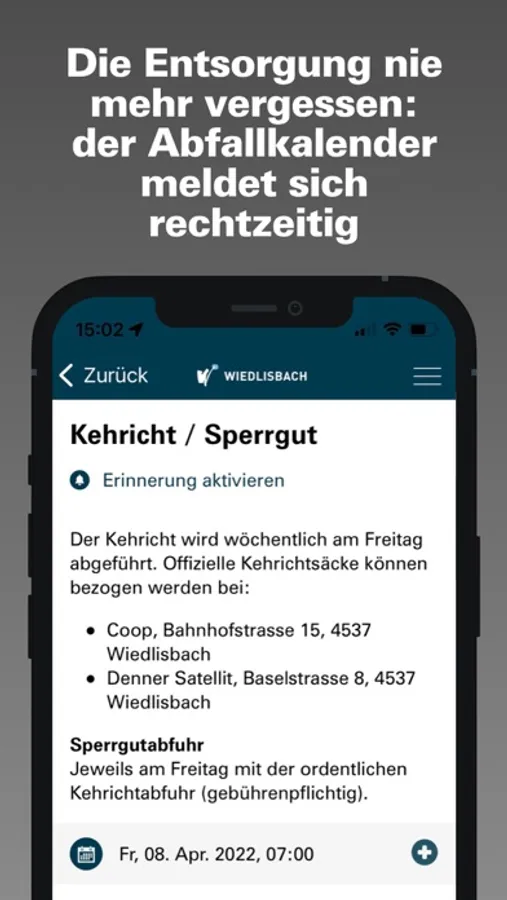 In unserer App finden Sie zahlreiche Informationen, News und Veranstaltungen. Ausserdem haben Sie die Möglichkeit, die Abfuhrdaten für verschiedene Abfälle als Push-Meldungen zu abonnieren.
