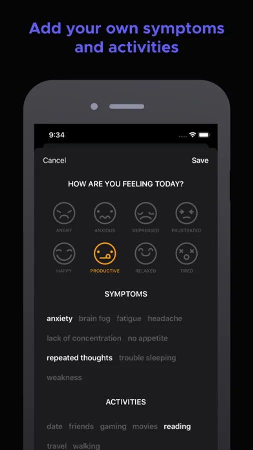 - Symptoms and activities are fully editable: you can delete them or add as many as you like. You can even use emojis in symptoms/activities names.