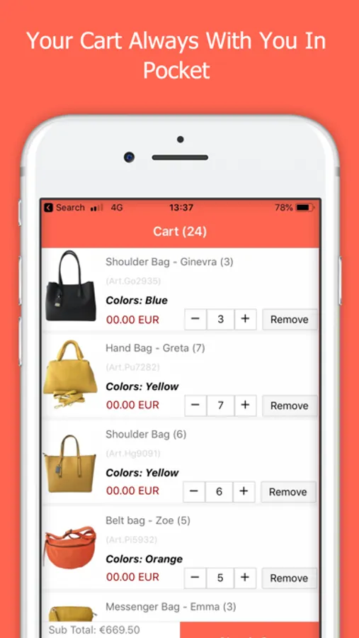 In the Cart section, it is possible to access only with the registration, which we have described in the previous part, this cart is synchronized with the e-commerce www.ingrossoborseonline.com, it will be constantly updated in the addition of new bags in the e-commerce or in the APP.