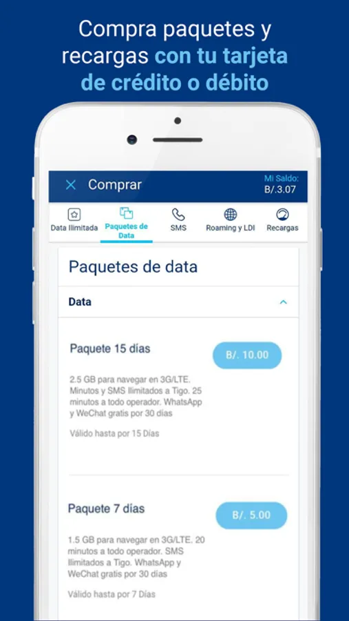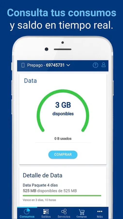 • Comprar y Activar otros Servicios:Adquiere paquetes de data adicionales, minutos, SMS y Roaming desde tu app.