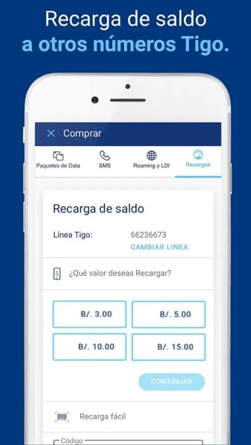 • Recargar en línea: Si quieres hacer recargas de saldo, con Mi Tigo puedes hacerlo de forma fácil y segura. Además, podrás escanear el código de tus tarjetas prepago para aplicar la Recarga Fácil. ¡No te quedes sin saldo!