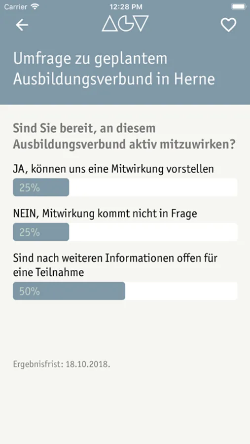 Wir befragen unsere Mitglieder regelmäßig zu verschiedenen Themen der Arbeitswelt und nutzen die Ergebnisse für unsere Presse- und Öffentlichkeitsarbeit. Sie können direkt innerhalb der App abstimmen und die Abstimmungsergebnisse anschauen, selbstverständlich anonymisiert.