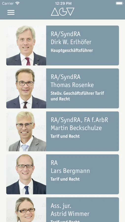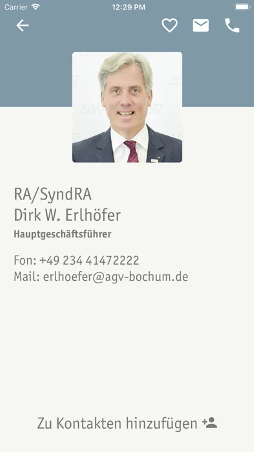 Alle AGV-Ansprechpartnerinnen und Ansprechpartner immer in der Tasche! Im Kontakt-Bereich finden Sie alle AGV-Kontakte. Rufen Sie uns einfach an oder schreiben Sie uns eine E-Mail. Und mit einem Tipp speichern Sie die für Sie relevanten Kontakte in Ihrem Telefonbuch.