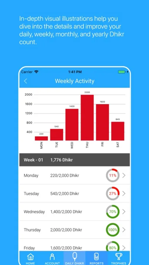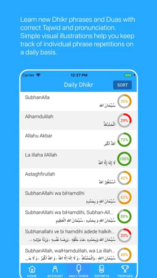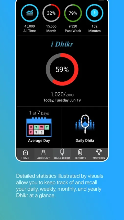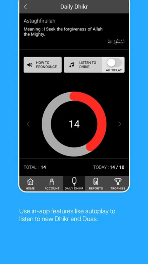 The interface and look are very important feature in every app which will interact you with app. There is no lengthy work in app just select dhikr and click on count button. You can save your record which you can continue next time. Just run this app using email to save your record. In home screen you can see how many times you tasbeeh dhikr. The unique features of this app which will allow you can also add any dhikr which is not already save in app. In trophies section you can also see your level which is based on your performance.