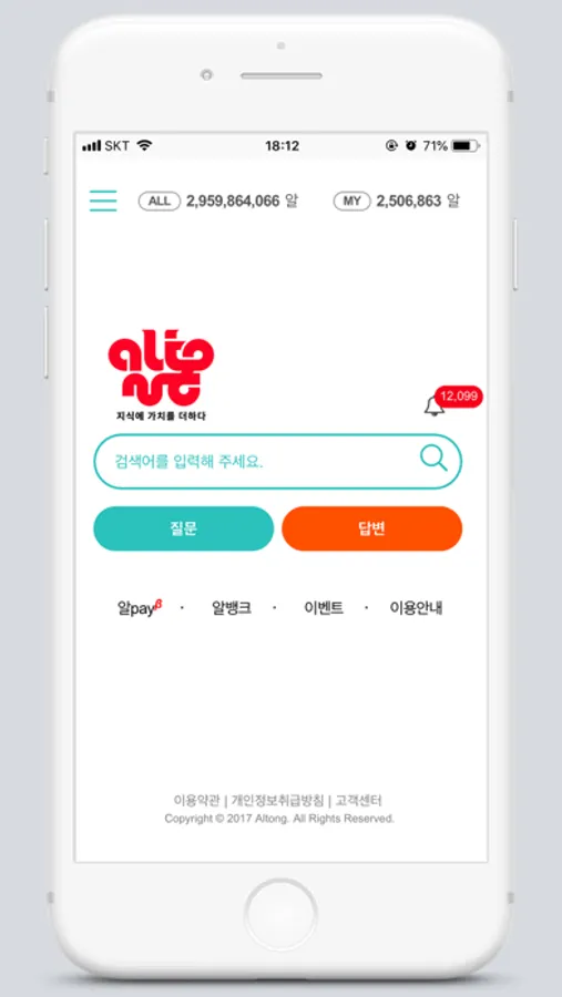 "알통"은 ㈜알통에 의해 개발 및 운영되고 이용자(회원)들이 만들어가는 지식공유 플랫폼입니다. "알통"은 기존의 유사 서비스와는 달리 수익을 이용자와 공유한다는 기본 이념에서 출발, 질문이나 답변을 등록하는 모든 이용자에게 실질적인 현금인 “알”의 형태로 경제적인 보상을 지급하는 혁신적인 서비스입니다.
