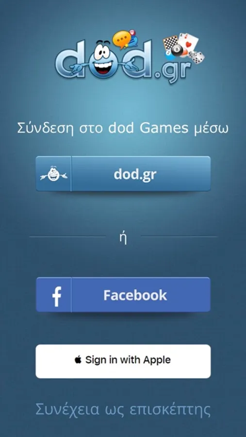 Στην αρχική οθόνη μπορείτε να συνδεθείτε με τον dod, τον Facebook ή τον Apple λογαριασμό σας, αν δεν έχετε κάποιον μπορείτε να φτιάξετε καινούριο λογαριασμό στο κουμπί dod.gr - Νέος Χρήστης.