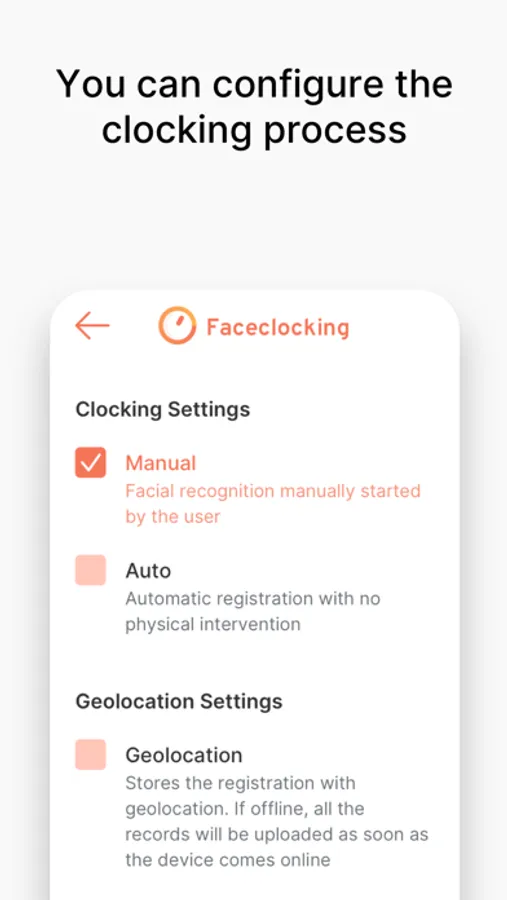 O processo de registo de ponto nunca foi tão fácil! Registe entradas e saídas sem necessidade de interação física. Se estive offline, a aplicação guardará os seus registos com recurso a geolocalização. Assim que existir ligação, os registos serão carregados em lacunas. A biometria facial dificulta também a falsificação de registos ao invés da utilização de outros métodos de picagem de ponto.