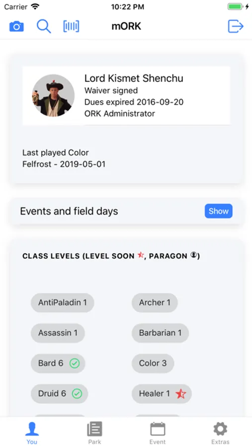 mORK is a mobile application for the players and administrators of Amtgard. mORK allows players to see a summary of their character and to easily upload a new ORK photo of themselves. mORK also allows a player to display a QR code of their account to their Chancellor for easy sign-in. Players can also create and share spell lists for the caster classes.