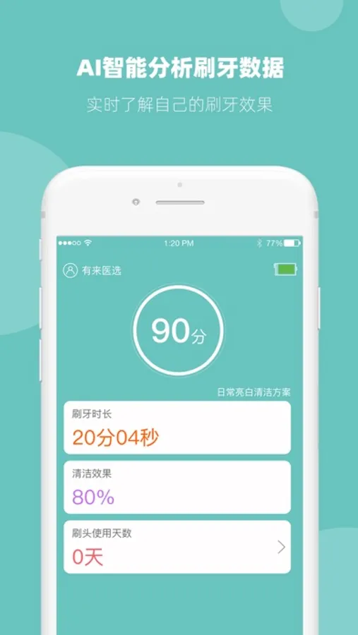 【电动牙刷智能评测系统】使用有来医选智能声波电动牙刷每一次刷牙后,智能评测系统将通过蓝牙数据传输展示您的刷牙时长,根据您的刷牙的力度,方向等,评估清洁效果。您可以根据智能评分养成更好的刷牙习惯。