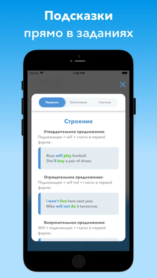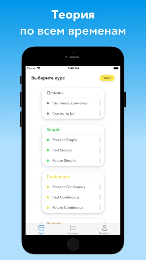 Изучайте первые разделы приложения абсолютно бесплатно! Если оно вам понравится, то вы сможете приобрести подписку Tense+, которая даёт полный доступ ко всем урокам и упражнениям.