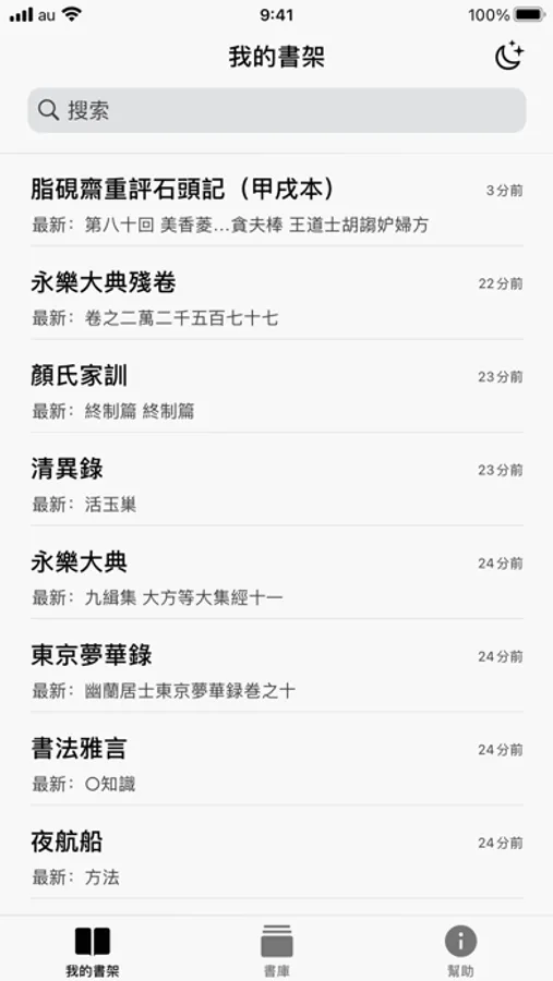 “书架“保存已经添加的作品,支持不同设备间的阅读进度同步,标签分类整理等。