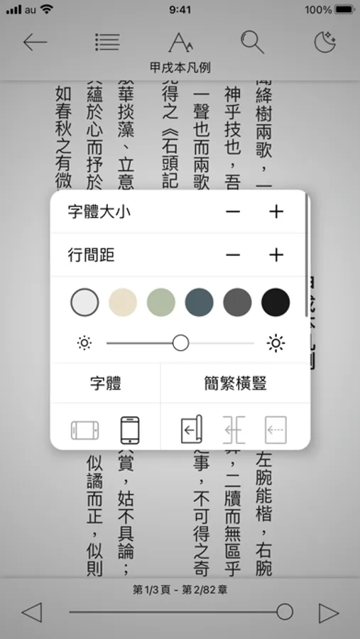 “竖排繁体”阅读,尽量原汁原味的呈现古籍经典阅读的乐趣。阅读界面支持多种翻页效果,可调节字体,行间距,页眉页脚自定制。