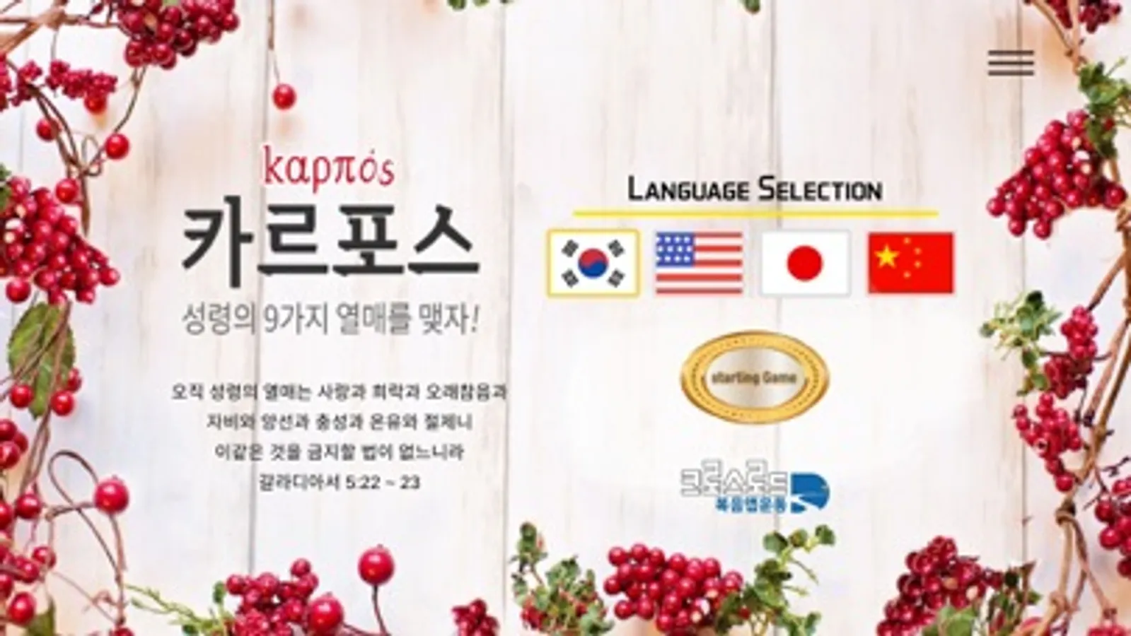 카르포스는 헬라어로 열매라는 뜻이며, 어원은 쟁취하다, 따오다 로서 "성령의 9가지 열매를 맺자!"가 부제가 됩니다. 이 게임은 스피드 게임으로 빠르게 움직이는 아이콘을 맞추면서 성령의 9가지 열매를 암송하게 하려는 목적이 있습니다.