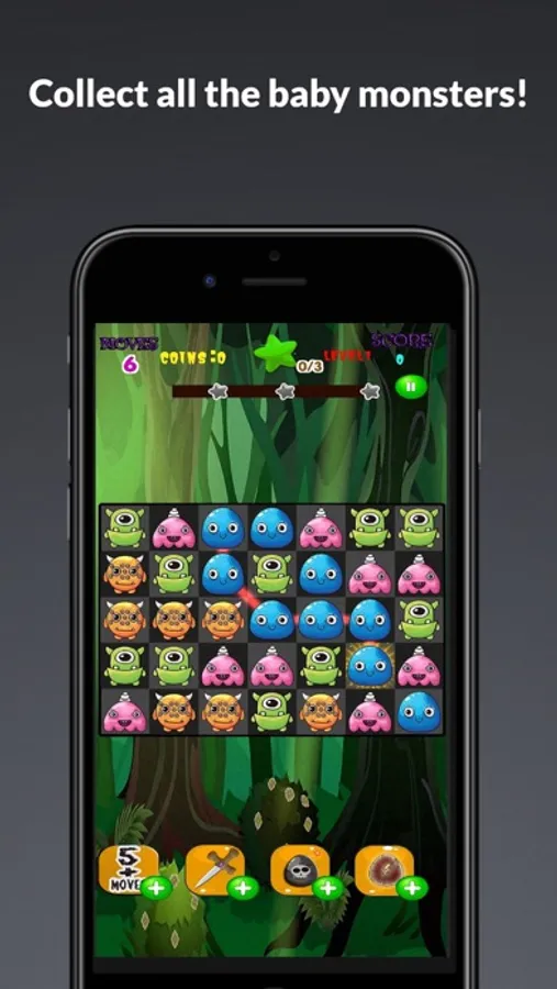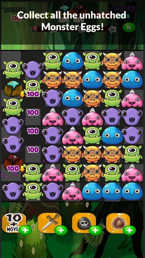 All the baby monster eggs have hatched and their moms are gone. It's your job to hunt and collect as many matching baby monsters as you can in the fewest moves possible. All to save forest from over populated with monsters. While you are hunting the baby monsters, you will clean up slime, collect unhatched eggs and feed them flies to trick them into leaving. Hurry! Time will run out , other times eggs will get frozen in place and if you make the wrong move some monsters multiply. Have fun and beware