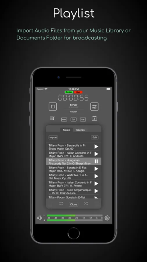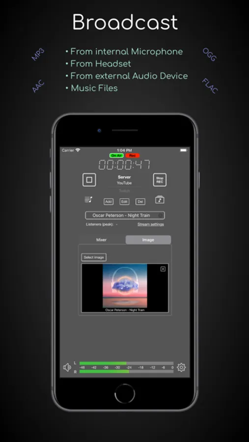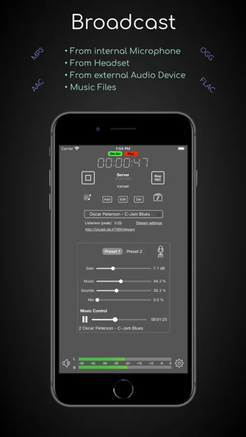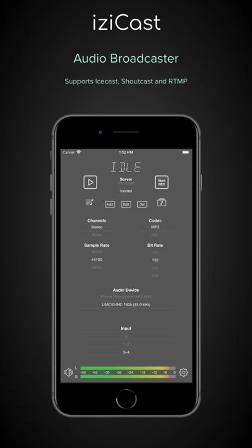 With iziCast you can broadcast audio from the internal microphone, external audio devices, audio files and Audiobus compatible apps to Icecast and Shoutcast and RTMP servers.