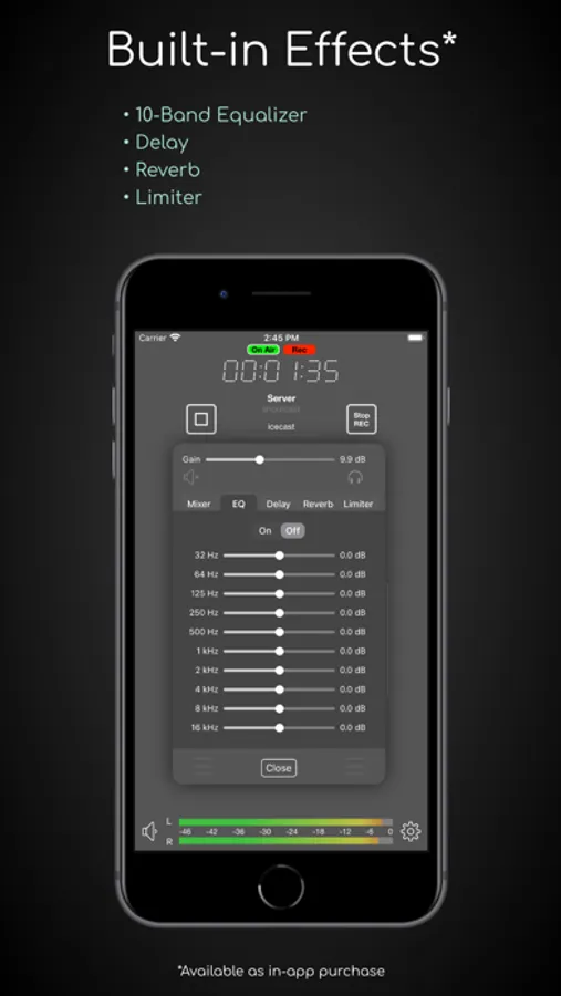 • Provides multiple effects via In-App Purchase (10-Band EQ, Delay, Reverb, Limiter)