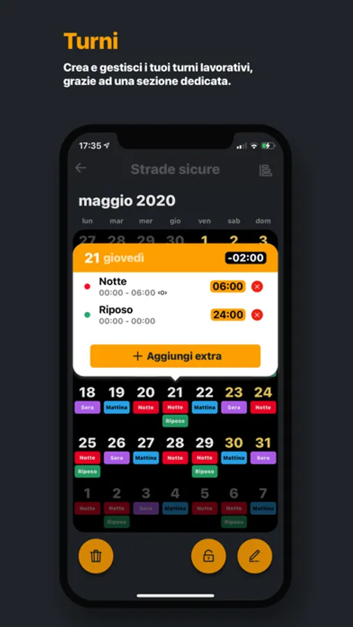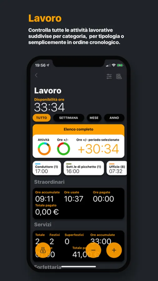 Gestisci le tue attività lavorative, Steccone calcolerà automaticamente le ore di straordinario, i giorni di CFG e i giorni di festività in base al tuo orario di lavoro. Puoi inserire straordinario, servizi, reperibilità e CFI, inserire le ore di recupero compensativo e le ore pagate.