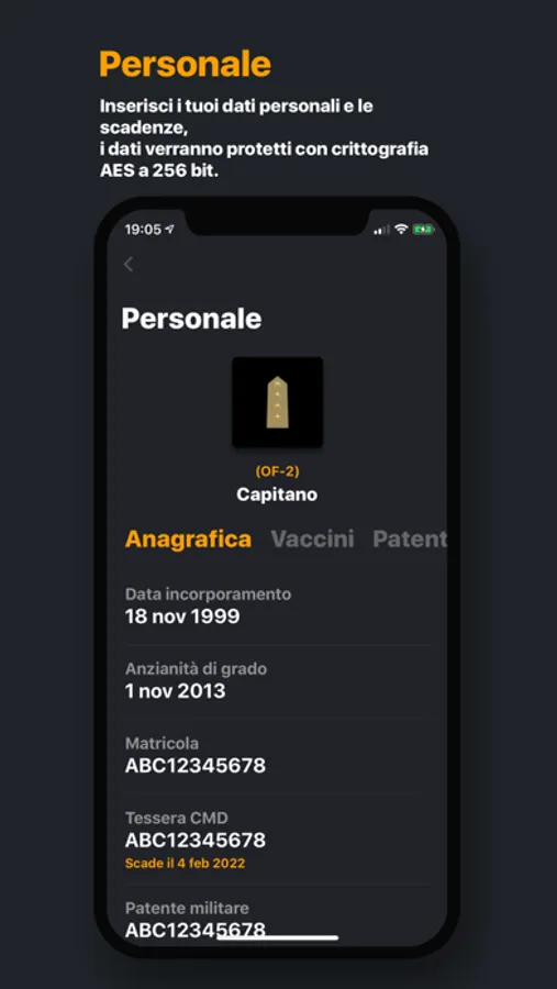 Seleziona il grado e inserisci tutte le informazioni personali che riguardano la tua carriera militare. Puoi aggiungere i vaccini con le rispettive scadenze e creare ogni tipo di inserimento personalizzato, al quale puoi assegnare una categoria e una scadenza.