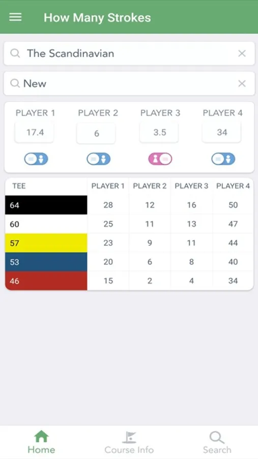 Just type in the Handicap for you and your Golf Buddies and you will immediately see How Many Strokes each of you have on each Tee Box.