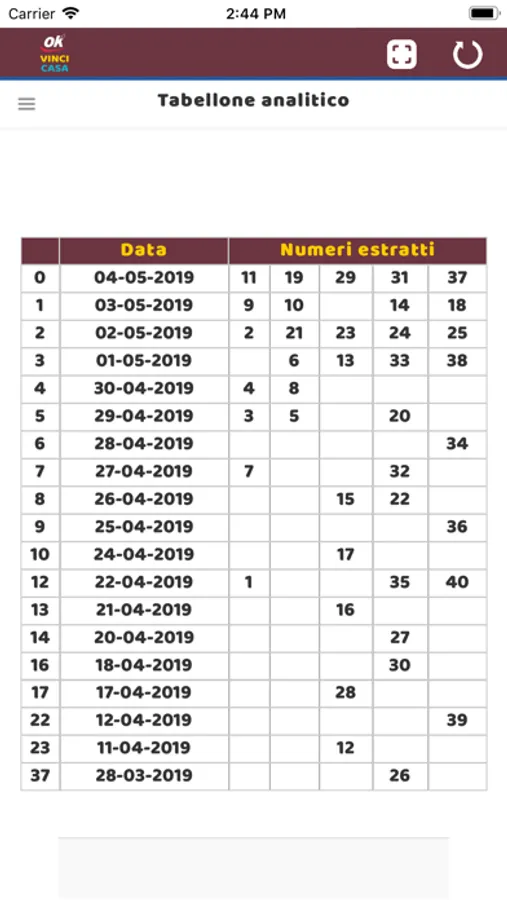 Il tabellone analitico dei 40 numeri mantiene traccia dell'ultima volta in cui è stato estratto un numero e la sua posizione del gioco VinciCasa